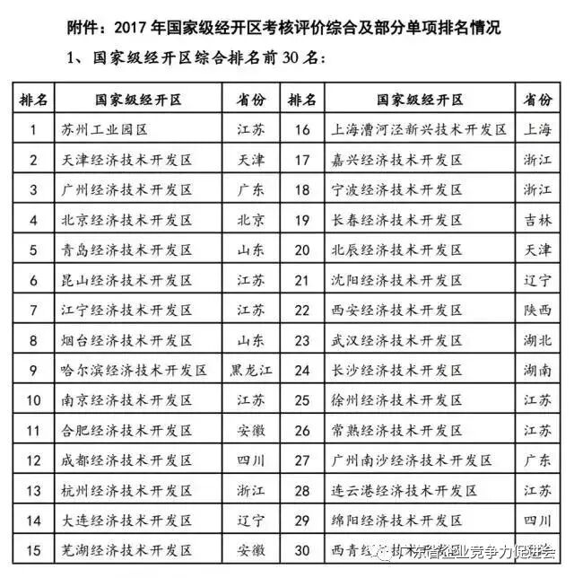 此次,考核评价综合排名前30名的国家级经开区东部地区有21家,中部地区6家,西部地区3家。详细名单如下: